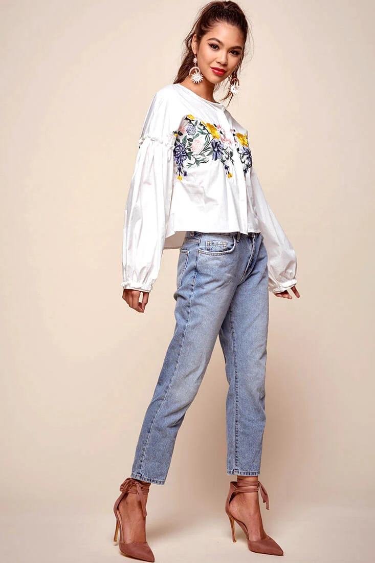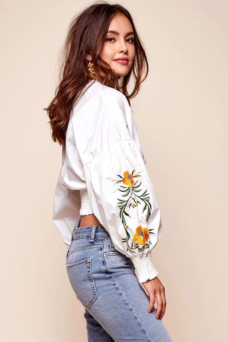 Olivia Floral Embroidered Cinched Wrist Shirt White