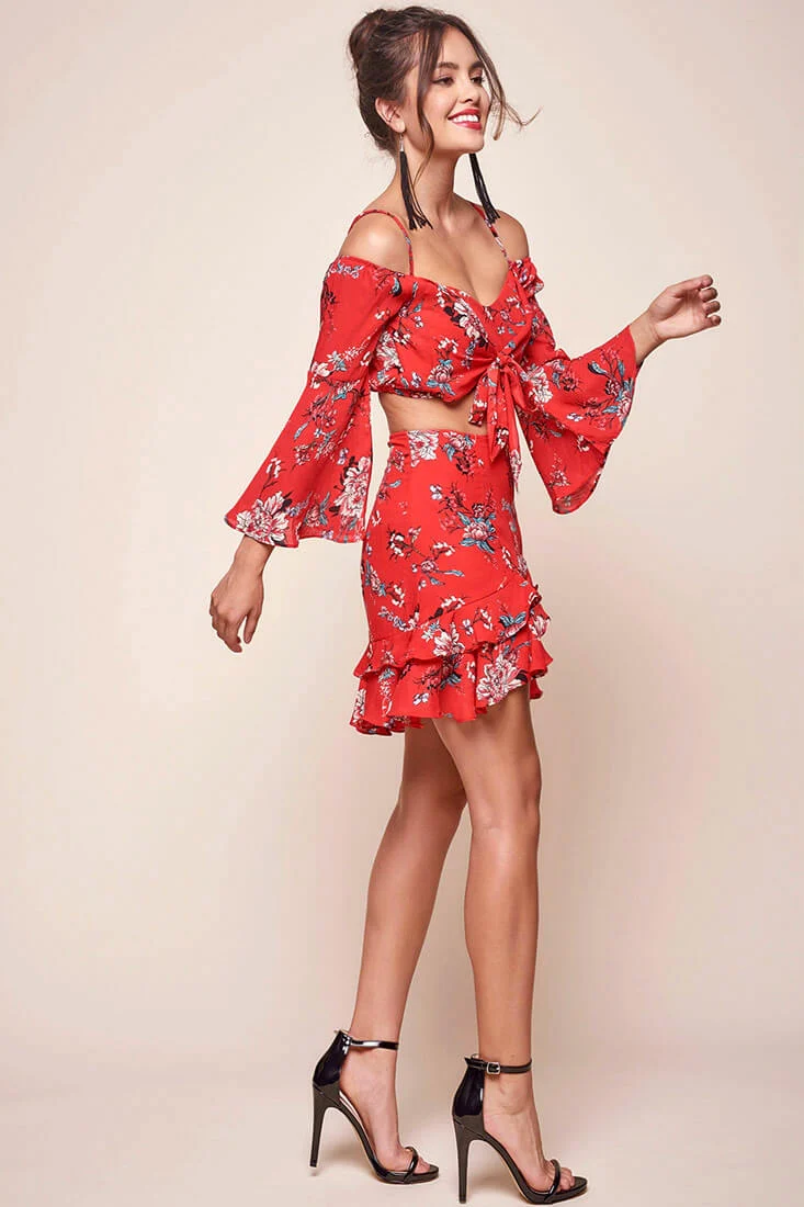 Bellamy Ruffled Bell Sleeve Floral Top Red