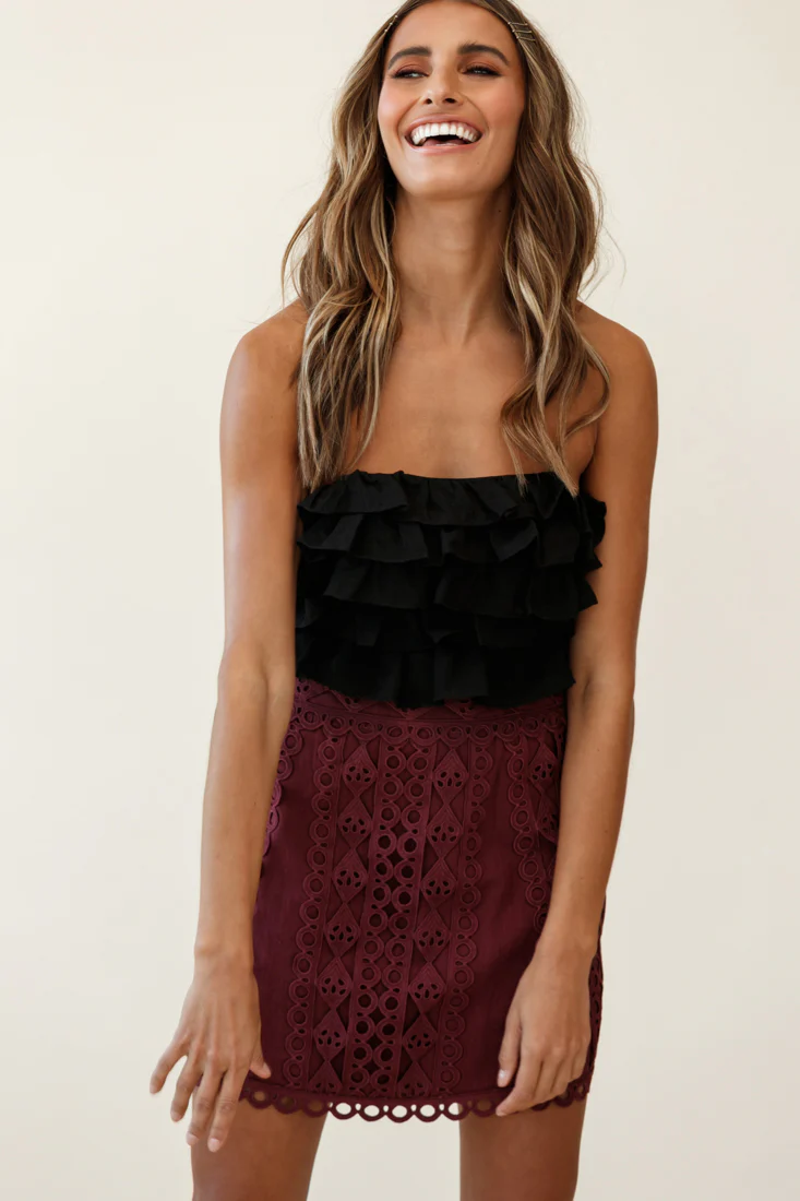Adrielle Lace Detail Fluted Hem Mini Skirt Black